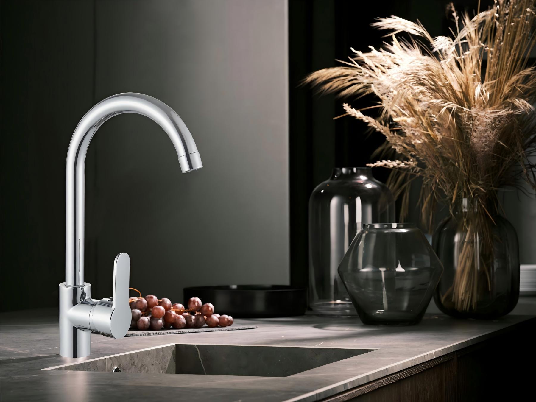 2. De hooggebogen wateruitloop ondersteunt een rotatie van 360° en bestrijkt het gehele gootsteengedeelte.